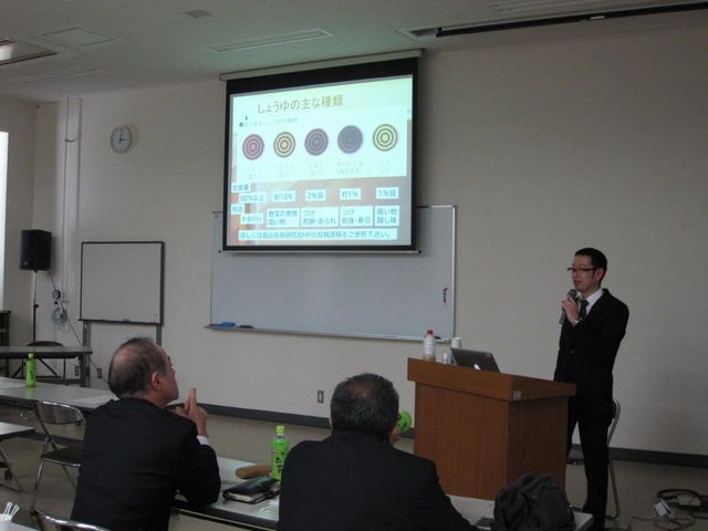 しょうゆ醸造の基礎と題して(株)テンヨ武田 製品本部の勝俣 賢氏からしょうゆ醸造の基礎とその種類や最近の品質保持技術について紹介していただいた。また、 実際にしょうゆの利味を行い、工程におけるしょうゆの味の差を体験した。 |