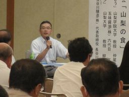| シンポジウム「美味しい甲斐・山梨の研究開発現場からの発信」では、最後に当研究会の辻会長が大会運営のアドバイザーを務める傍ら山梨県食品技術研究会の活動を紹介しました。 | ![]() |