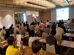 ベトナム国立食品研究所において開催したワークショップでの自己紹介風景 (当日は小宮山会長、遠藤副会長、元山梨県工業技術センター客員研究員の深澤先生の3人が講演した) |